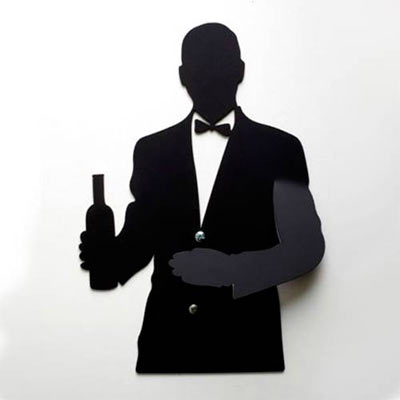 מתלה בדמות צללית של מלצר, המחזיק ביד אחת בקבוק יין וביד השנייה מגבת.המוצר עשוי מתכת.